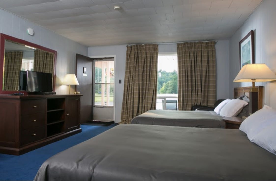 Unwind after a day exploring the lakes, trails, and waterways of Seeleys Bay in this comfortable room featuring two queen-size beds. The space is thoughtfully designed for relaxation and convenience, offering large windows with abundant natural light, a spacious closet, and a beautiful bathroom with a tub—perfect for unwinding after a day outdoors. A fridge and microwave make it easy to enjoy snacks or simple meals, while the flat-screen TV provides a cozy way to end the evening.