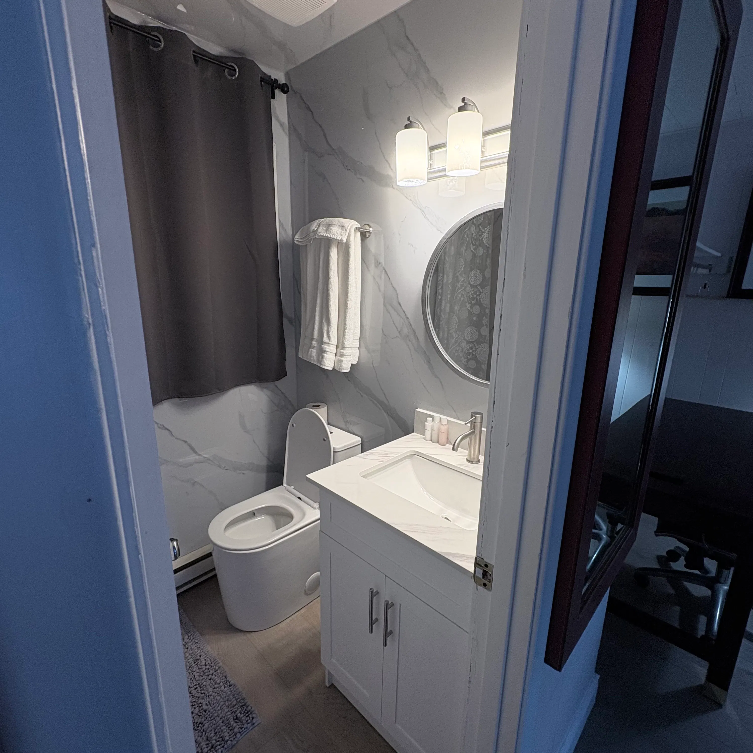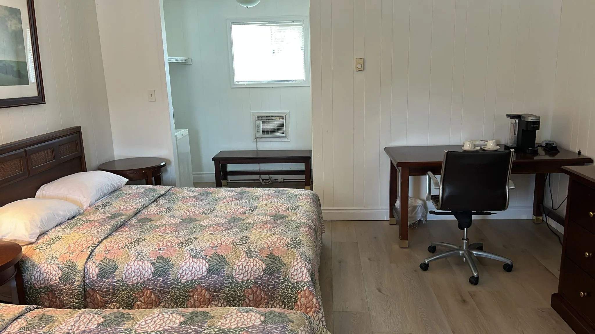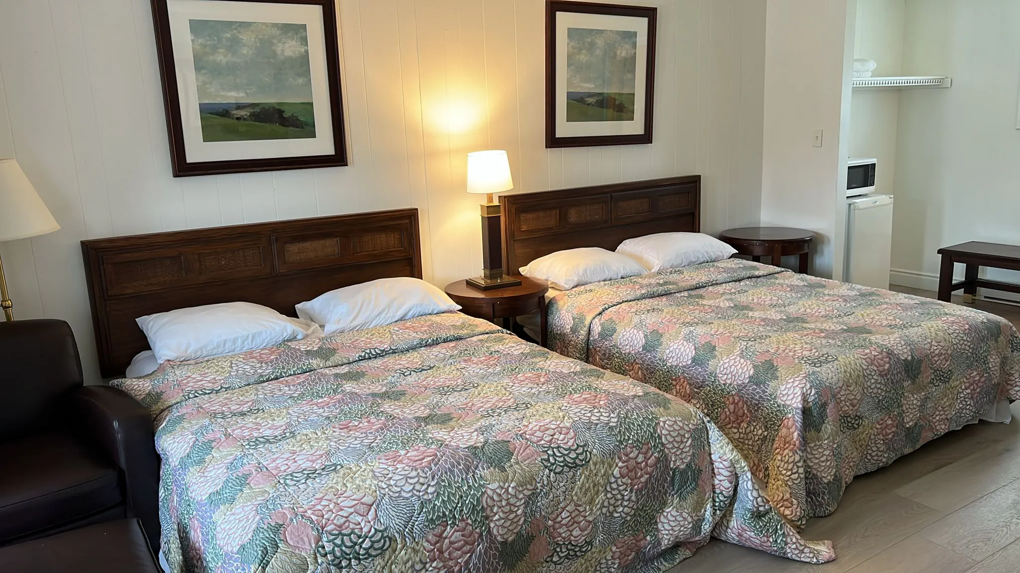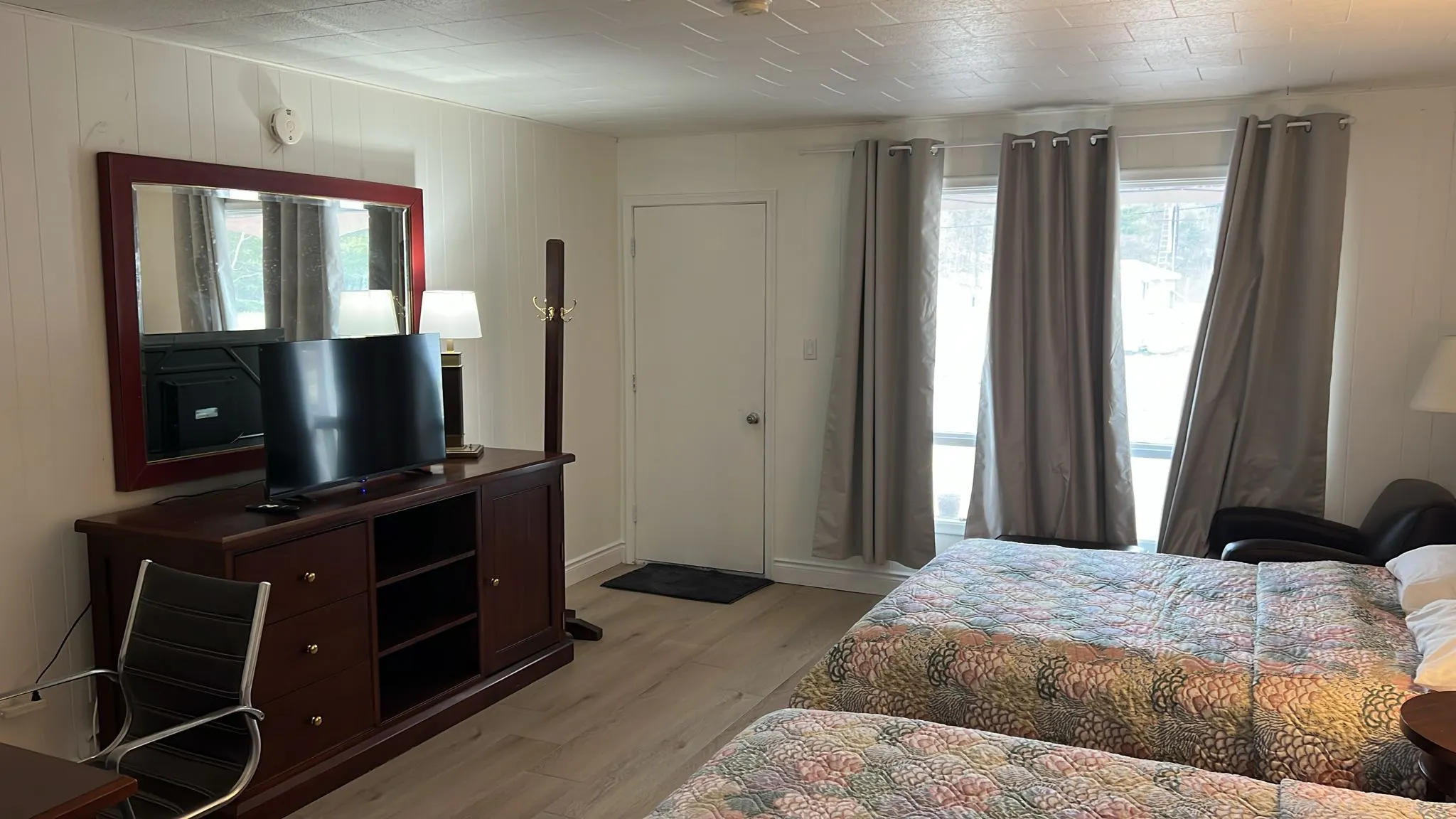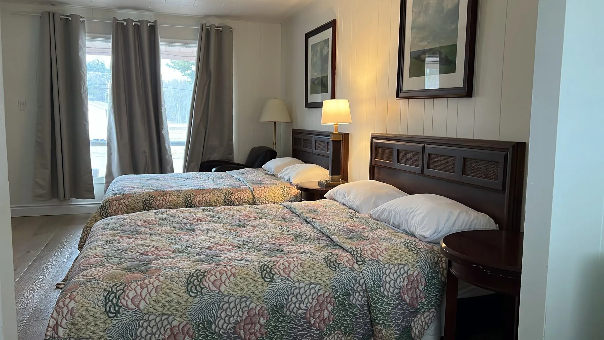 Unwind after a day exploring the lakes, trails, and waterways of Seeleys Bay in this comfortable room featuring two queen-size beds. The space is thoughtfully designed for relaxation and convenience, offering large windows with abundant natural light, a spacious closet, and a beautiful bathroom with a tub—perfect for unwinding after a day outdoors. A fridge and microwave make it easy to enjoy snacks or simple meals, while the flat-screen TV provides a cozy way to end the evening.